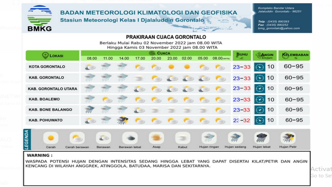 Berikut prakiraan cuaca Gorontalo oleh BMKG Rabu 2 November 2022 berlaku mulai jam 08.00 WITA (24 jam ke depan):