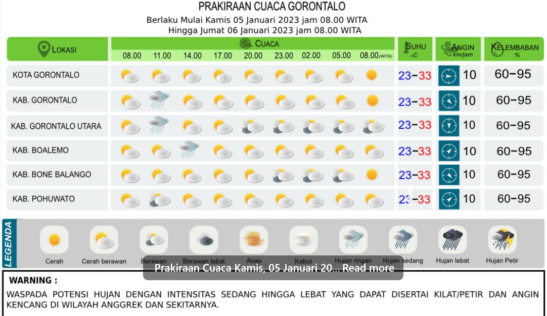 TRIBUNGORONTALO.COM, Gorontalo - BMKG mengeluarkan peringatan dini cuaca untuk Provinsi Gorontalo pada Kamis 5 Januari 2023 hari ini.