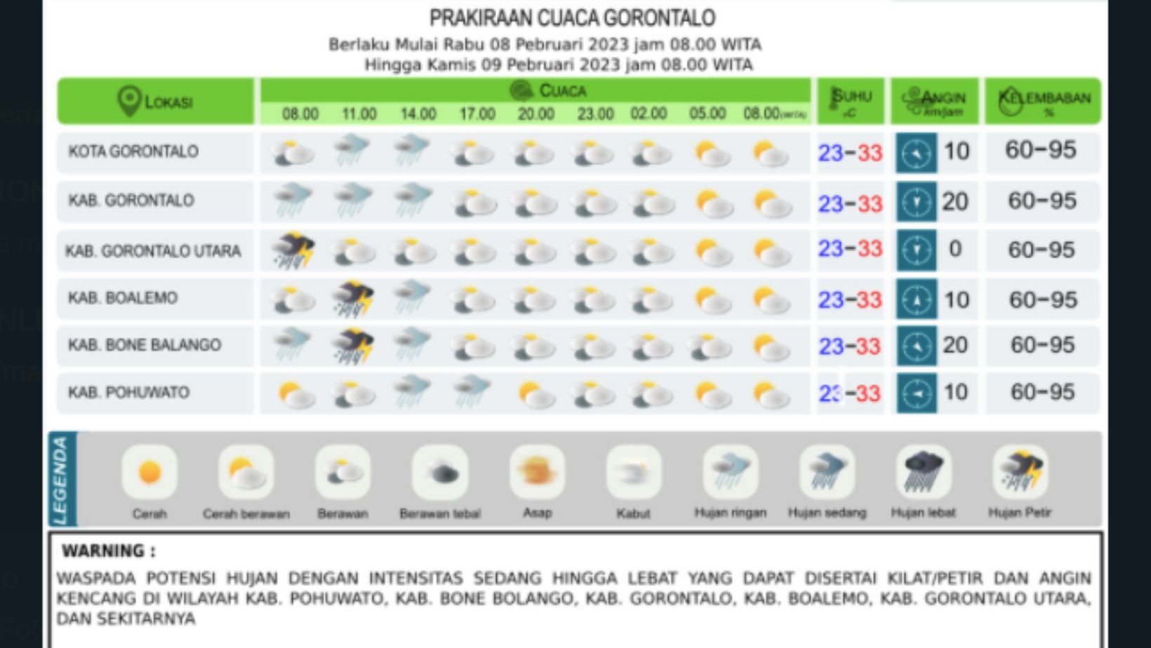 Prakiraan cuaca yang dirilis BMKG Gorontalo pada Rabu 8 Februari 2023 berlaku mulai jam 08.00 Wita (24 jam).
