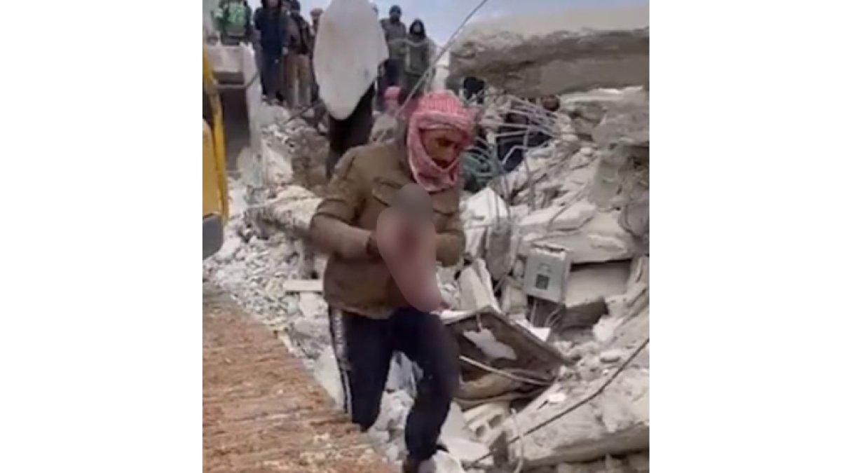 Dalam video tersebut tampak seorang pria menggendong bayi tersebut keluar dari puing-puing bangunan.