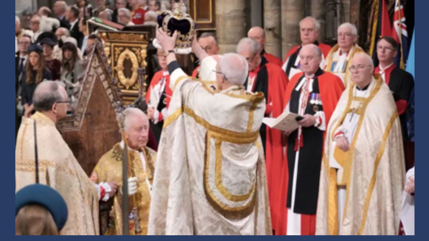 Pada momen paling penting dalam upacara penobatan, Uskup Agung Canterbury Justin Welby meletakkan Mahkota Santo Edward yang berusia 360 tahun di kepala Charles. Pemimpin spiritual Gereja Anglikan ini kemudian menyatakan: "Tuhan Selamatkanlah Sang Raja."