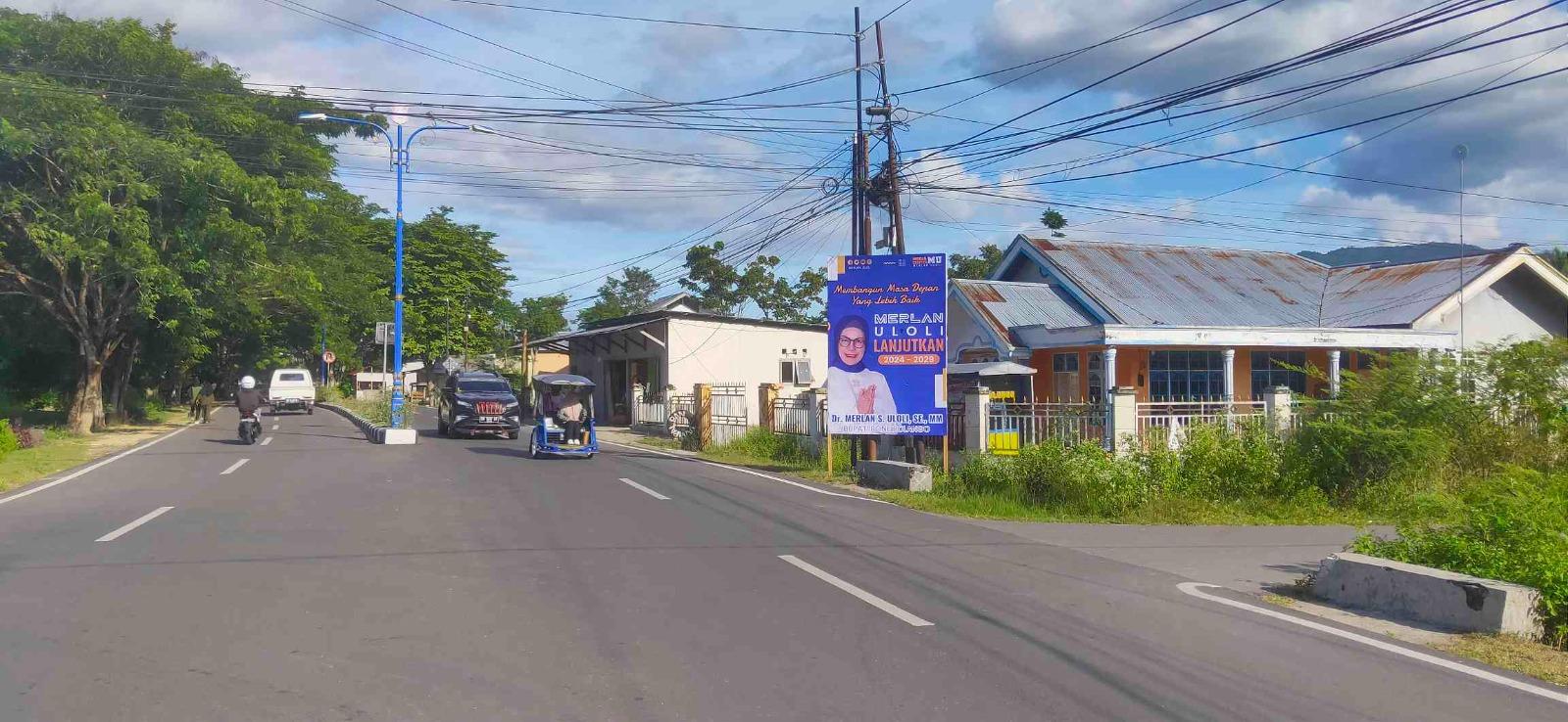 Tertera dalam baliho tersebut terdapat Gambar Merlan Uloli dengan pakaian putih dan kerudung berwarna biru.