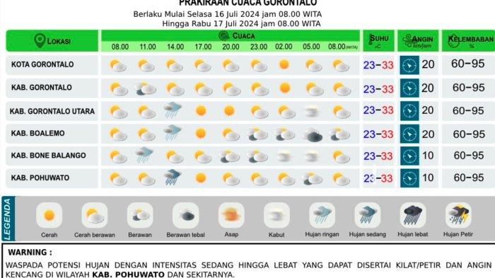 Prakiraan cuaca oleh BMKG hari ini, disebutkan bahwa Provinsi Gorontalo akan mengalami berbagai kondisi cuaca yang menarik selama 24 jam.