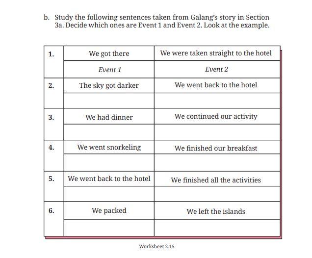 b. Study the following sentences taken from Galang’s story in Section 3a. Decide which ones are Event 1 and Event 2. Look at the example.