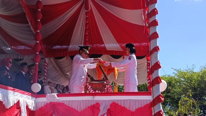 Bupati Gorontalo Utara Thariq Modanggu menyerahkan bendera merah putih untuk dikibarkan pada pukul 09.18 Wita.