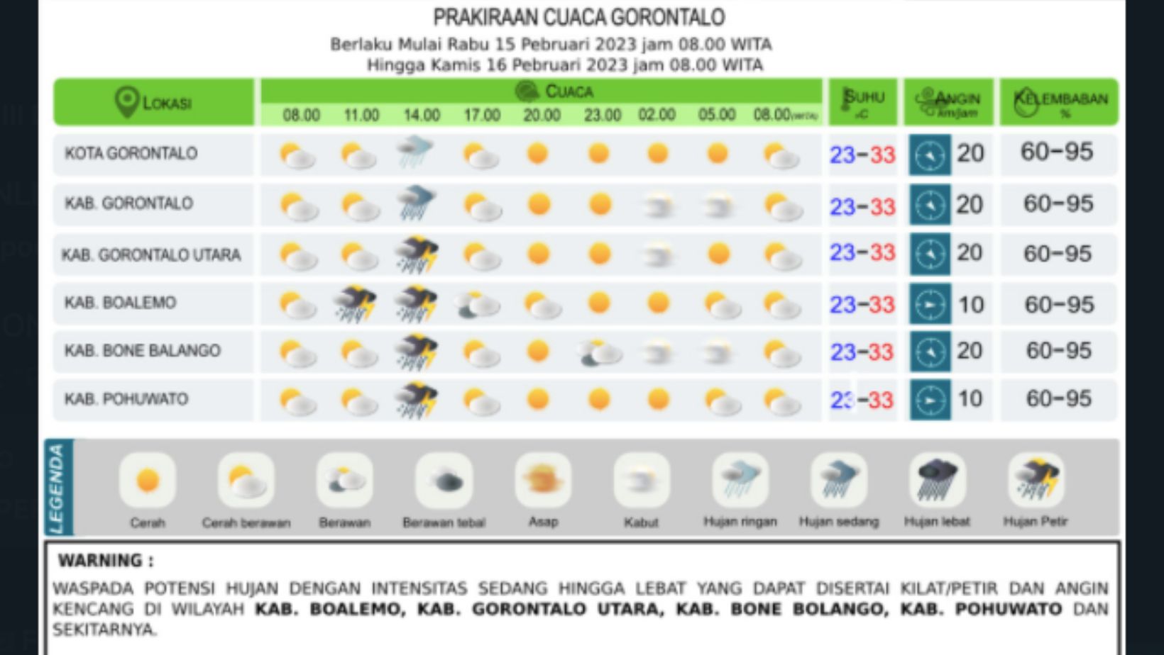 Hujan lebat disertai petir/kilat berpotensi di Kabupaten Boalemo, Gorontalo Utara, Bone Bolango dan Pohuwato pada hari ini Rabu 15 Februari 2023.